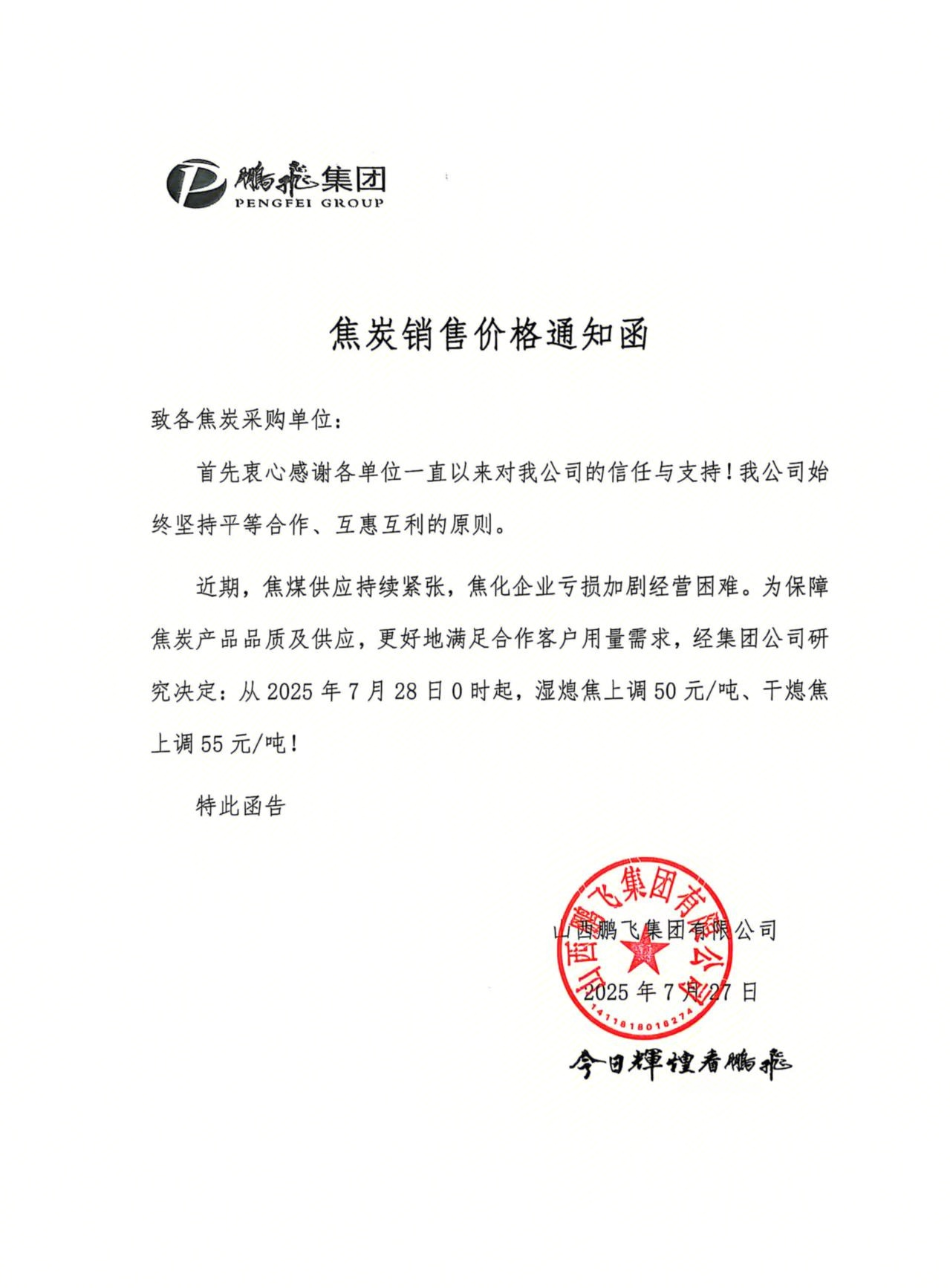 近期,焦煤供应持续紧张,焦化企业亏损加剧经营困难。为保障焦炭产品品质及供应,更好地满足合作客户用量需求,经集团公司研究决定:从 2025年7月28日0时起,湿熄焦上调50元/吨、干熄焦上调55元/吨!