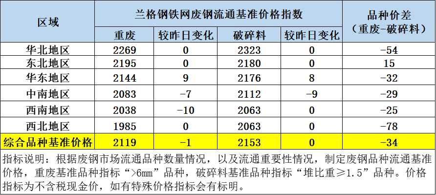 7月28日兰格钢铁网废钢流通基准价格指数为2136跌1:其中重废品种综合基准价格指数为2119跌1,破碎料品种综合基准价格指数为2153持平。分区域华北地区重废2269(0)破碎料2323(0);东北地区重废2195(0)破碎料2180(0);华东地区重废2144(↑9)破碎料2178(↑8);中南地区重废2083(↓7)破碎料2112(↓9);西南地区重废2038(↓10)破碎料2063(0);西北地区重废1985(0)破碎料2063(0)。