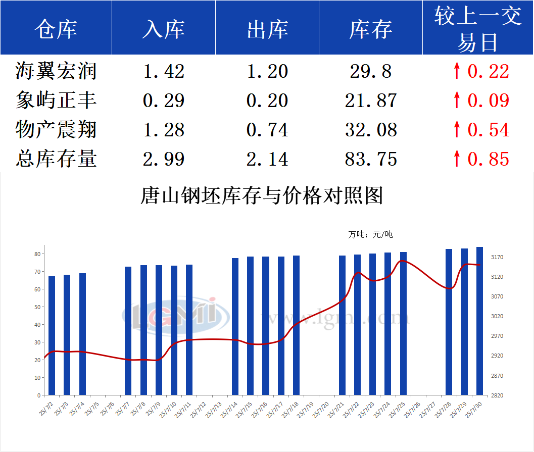 截至今晨,唐山地区样本仓库钢坯库存总量约83.75万吨,单日入库总量2.99万吨,出库总量2.14万吨。