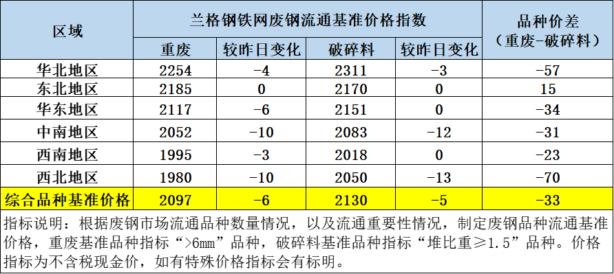 8月4日兰格钢铁网废钢流通基准价格指数为2114跌5:其中重废品种综合基准价格指数为1097跌6,破碎料品种综合基准价格指数为2130跌5。分区域华北地区重废2254(↓4)破碎料2311(↓3);东北地区重废2185(0)破碎料2170(0);华东地区重废2117(↓6)破碎料2151(0);中南地区重废2052(↓10)破碎料2083(↓12);西南地区重废1995(↓3)破碎料2018(0);西北地区重废1980(↓10)破碎料2050(↓13)。