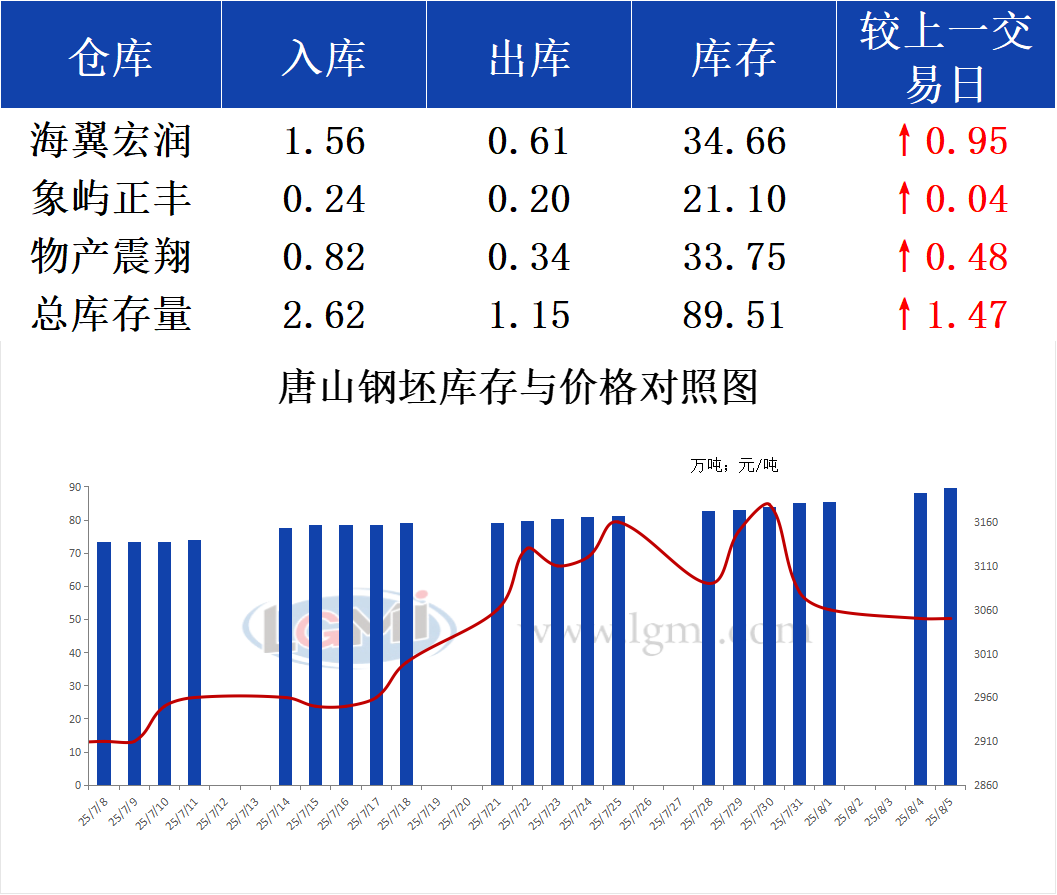 截至今晨,唐山地区样本仓库钢坯库存总量约89.51万吨,单日入库总量2.62万吨,出库总量1.15万吨。