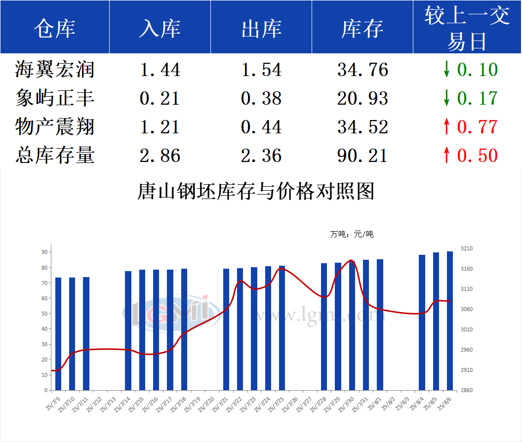 截至今晨,唐山地区样本仓库钢坯库存总量约90.21万吨,单日入库总量2.86万吨,出库总量2.36万吨。
