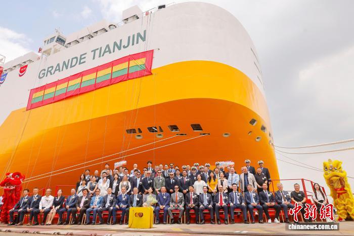 中新网上海8月8日电 (记者 殷立勤)8月8日,由中国船舶集团有限公司旗下上海外高桥造船有限公司为意大利Grimaldi公司建造的首艘9000车位汽车运输船“GRANDE TIANJIN”号命名交付。