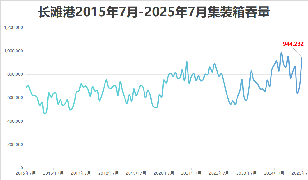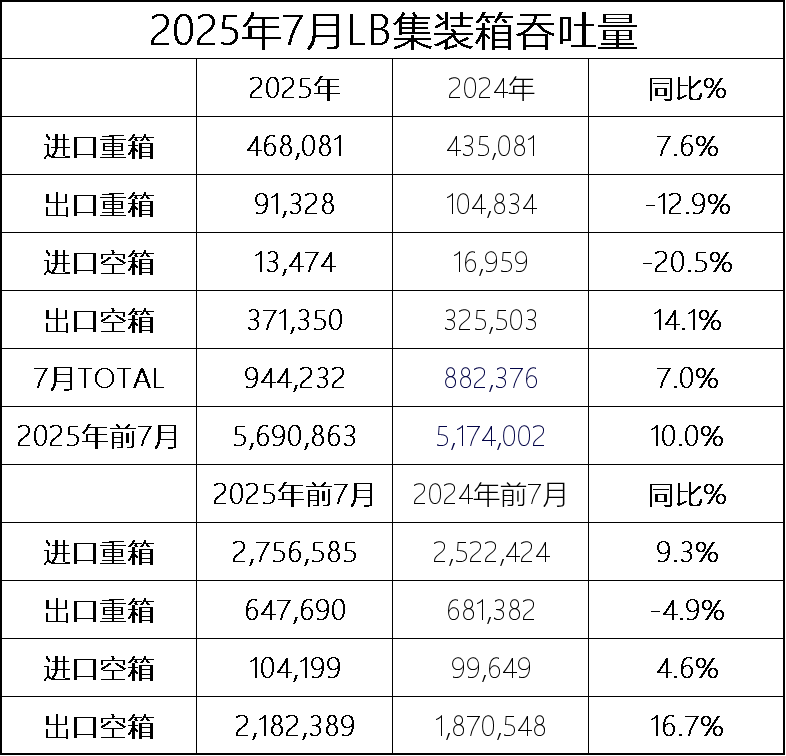 2025年前7个月,长滩港集装箱吞吐量达到569.1万TEU,较去年同期增长10.0%。其中进口重箱增长9.3%,至275.6万TEU,出口重箱同比下降4.9%至64.8万TEU。