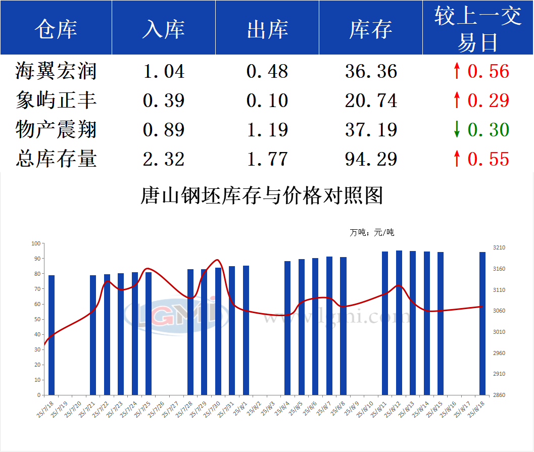 截至今晨,唐山地区样本仓库钢坯库存总量约94.29万吨,单日入库总量2.32万吨,出库总量1.77万吨。