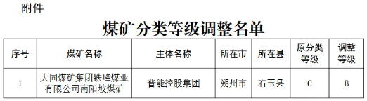 2025年8月份接到朔州市1座煤矿关于调整煤矿分类等级的报告,按照《山西省人民政府办公厅关于印发山西省煤矿分级分类安全监管监察办法的通知》(晋政办发〔2020〕22 号)第九条第二款和有关分类标准规定,经审核,同意大同煤矿集团铁峰煤业有限公司南阳坡煤矿由C类调整为B类。现将调整后煤矿分类名单进行公告,各级煤矿安全监管监察部门按照调整后的类别实施监管监察工作。其他煤矿分类等级仍按《山西省安全生产委员会办公室关于公布 2025 年度煤矿分类名单的通知》(晋安办发〔2025〕2 号)执行。