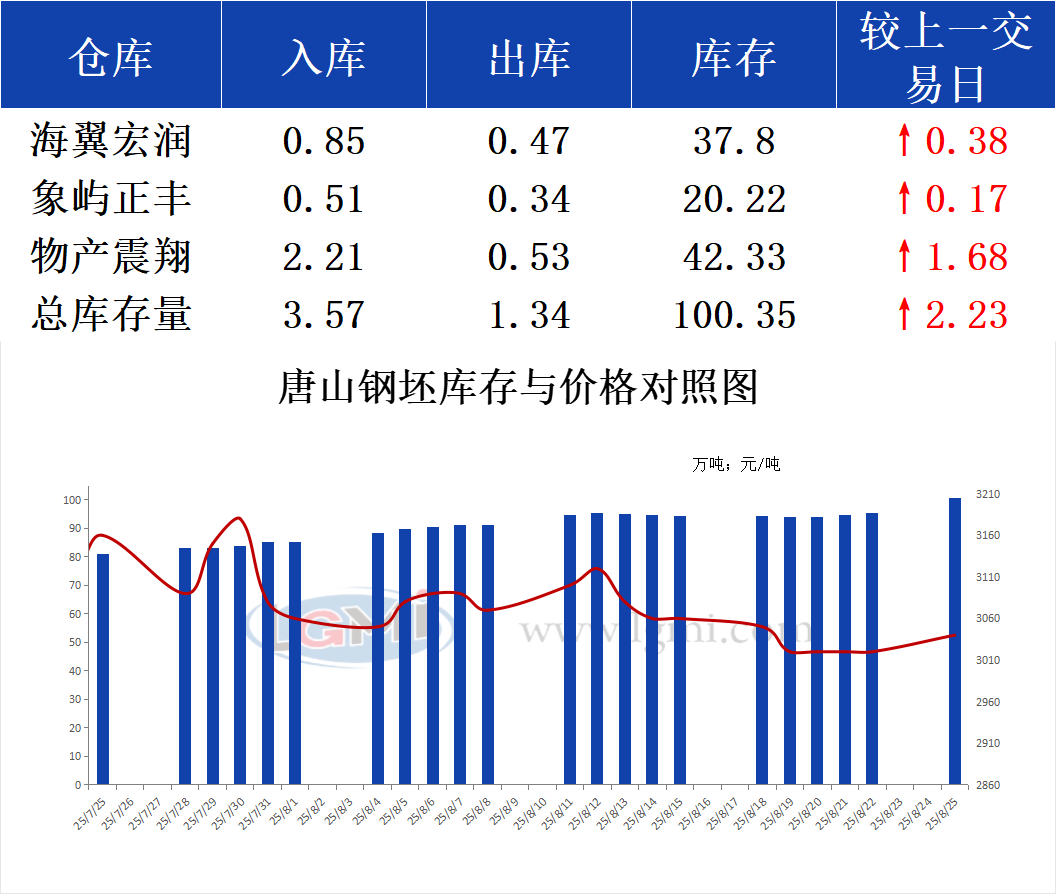 截至今晨,唐山地区样本仓库钢坯库存总量约100.35万吨,单日入库总量3.57万吨,出库总量1.34万吨。