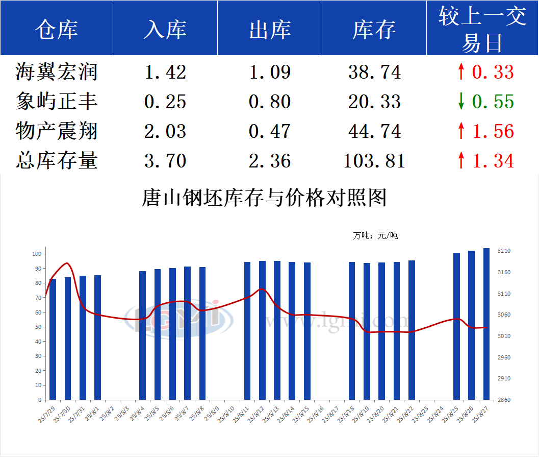 截至今晨,唐山地区样本仓库钢坯库存总量约103.81万吨,单日入库总量3.7万吨,出库总量2.36万吨。