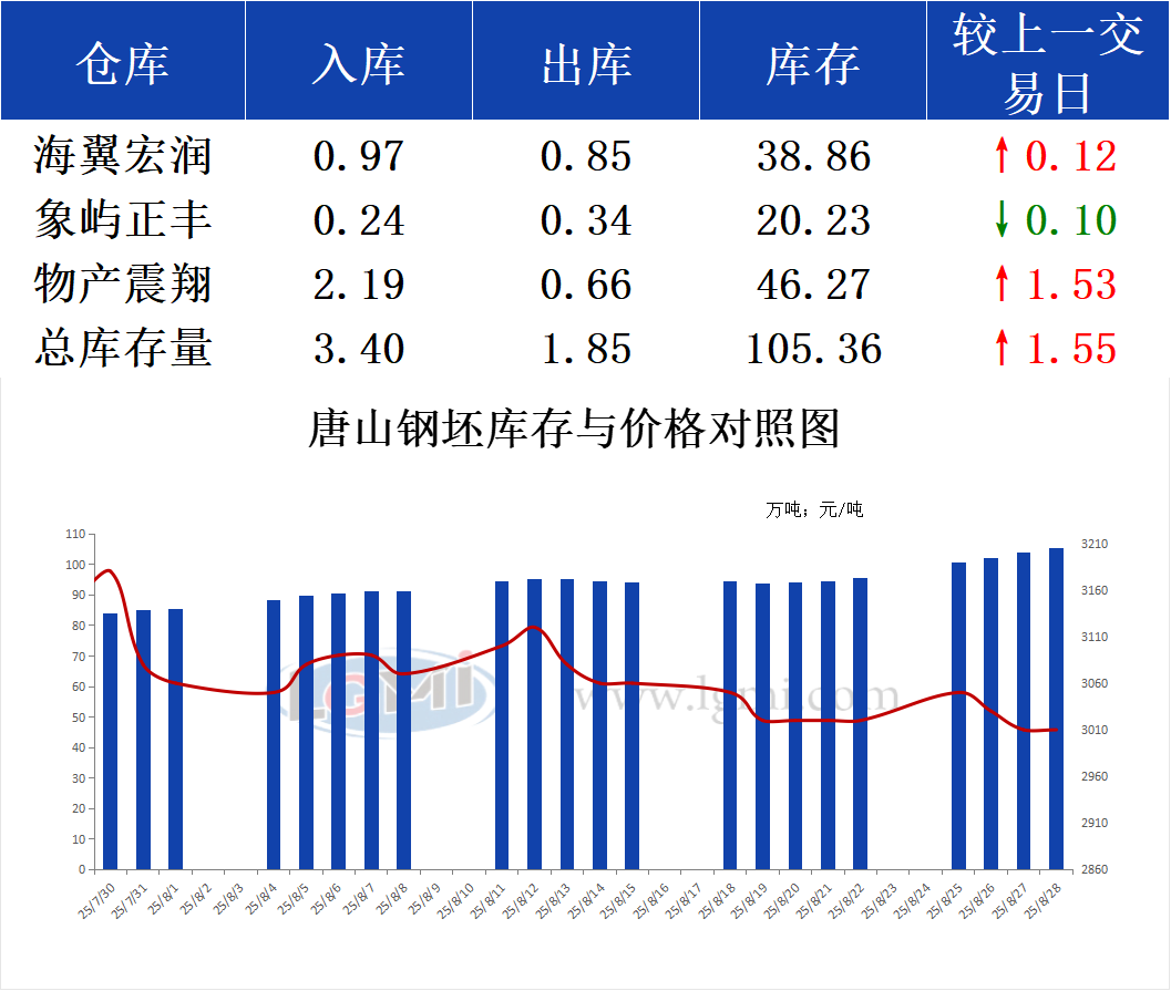 截至今晨,唐山地区样本仓库钢坯库存总量约105.36万吨,单日入库总量3.4万吨,出库总量1.85万吨。