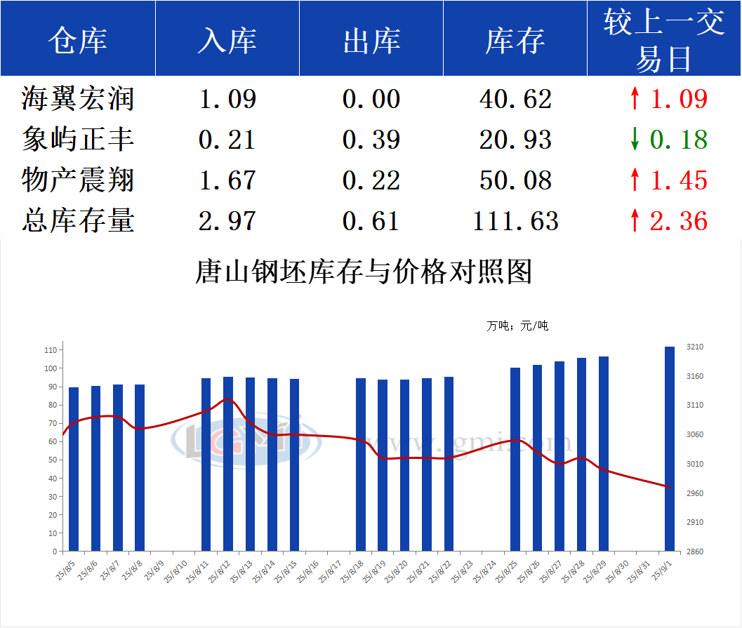 9月1日唐山钢坯库存早报