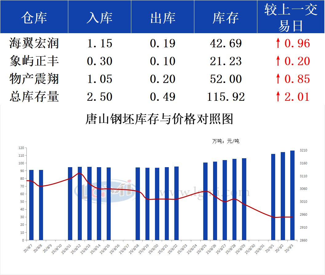 截至今晨,唐山地区样本仓库钢坯库存总量约115.92万吨,单日入库总量2.5万吨,出库总量0.49万吨。