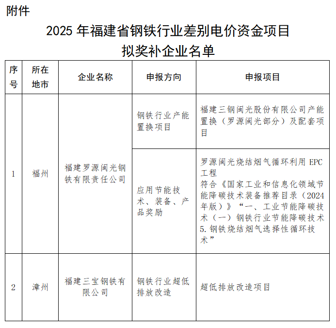 根据《福建省工业和信息化厅关于开展2025年钢铁行业差别电价资金项目申报工作的通知》(闽工信函新材〔2025〕192号)要求,经设区市工信部门审核、专家评审、相关部门涉黑涉恶和失信惩戒查询等环节,福建罗源闽光钢铁有限责任公司等2家企业符合申报要求,现予公示。如有异议,请在公示之日起五个工作日内向省工信厅反馈。