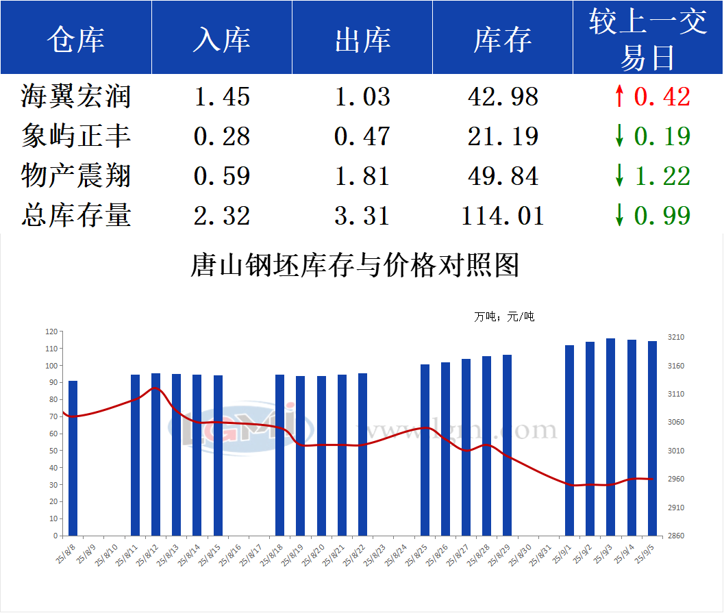 截至今晨,唐山地区样本仓库钢坯库存总量约114.01万吨,单日入库总量2.32万吨,出库总量3.31万吨。