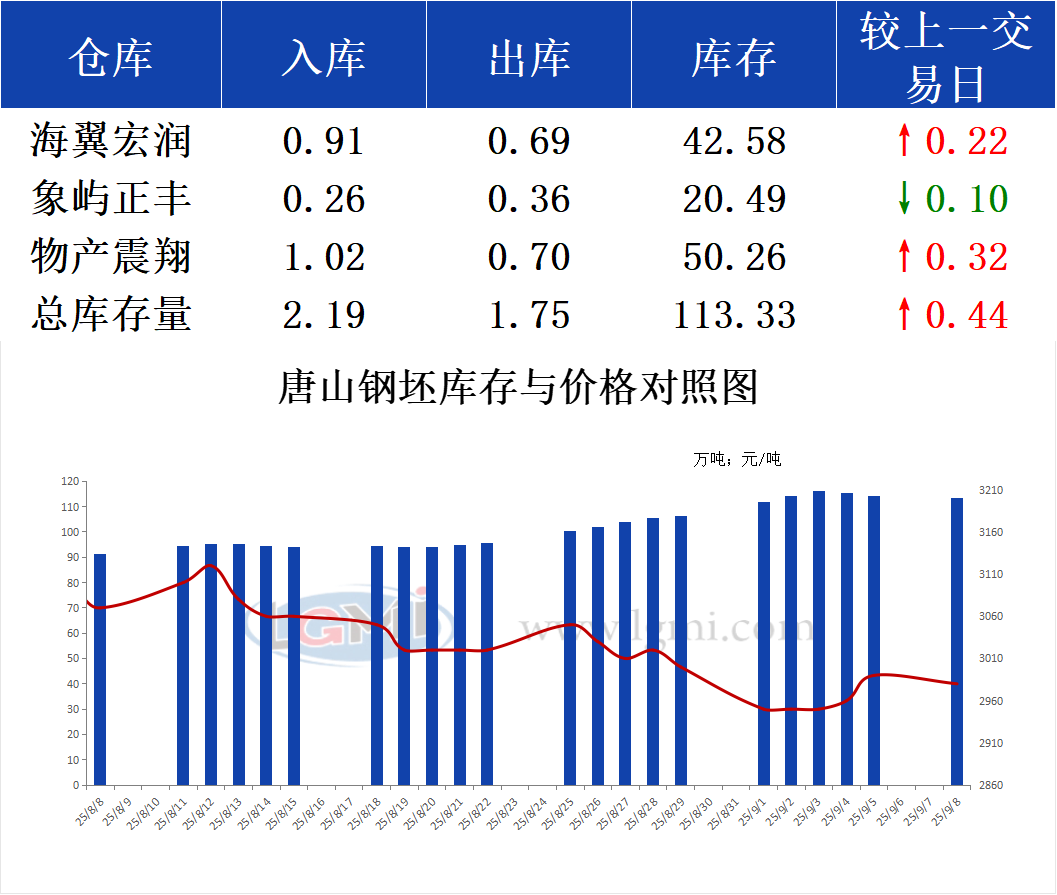 截至今晨,唐山地区样本仓库钢坯库存总量约113.33万吨,单日入库总量2.19万吨,出库总量1.75万吨。