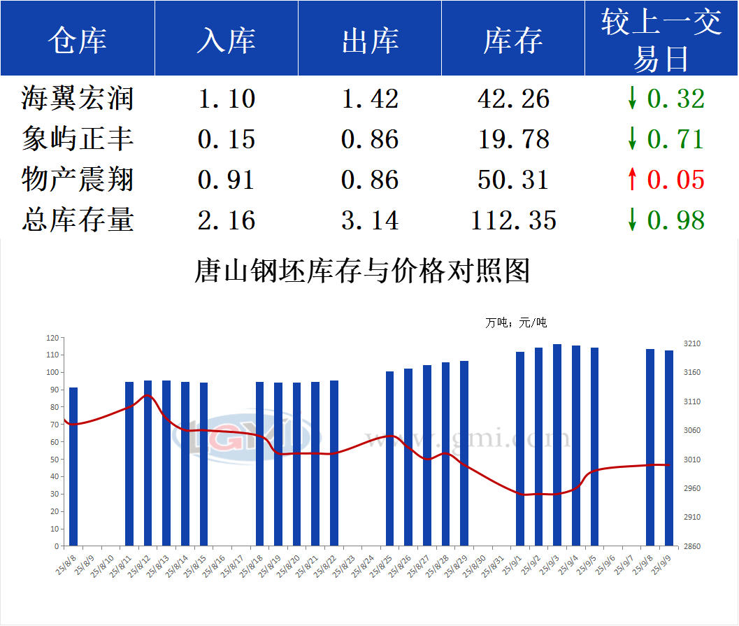 截至今晨,唐山地区样本仓库钢坯库存总量约112.35万吨,单日入库总量2.16万吨,出库总量3.14万吨。