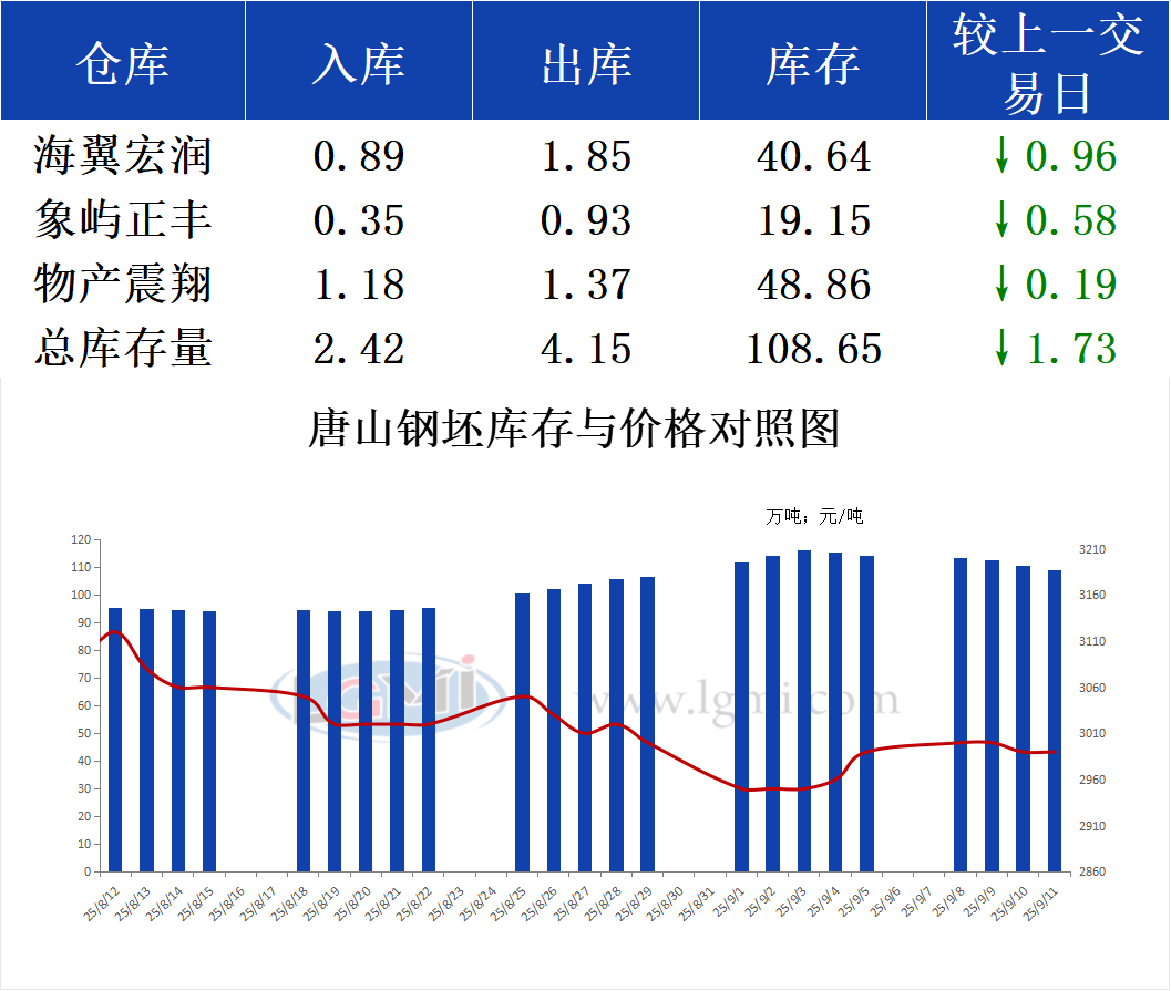 截至今晨,唐山地区样本仓库钢坯库存总量约108.65万吨,单日入库总量2.42万吨,出库总量4.15万吨。