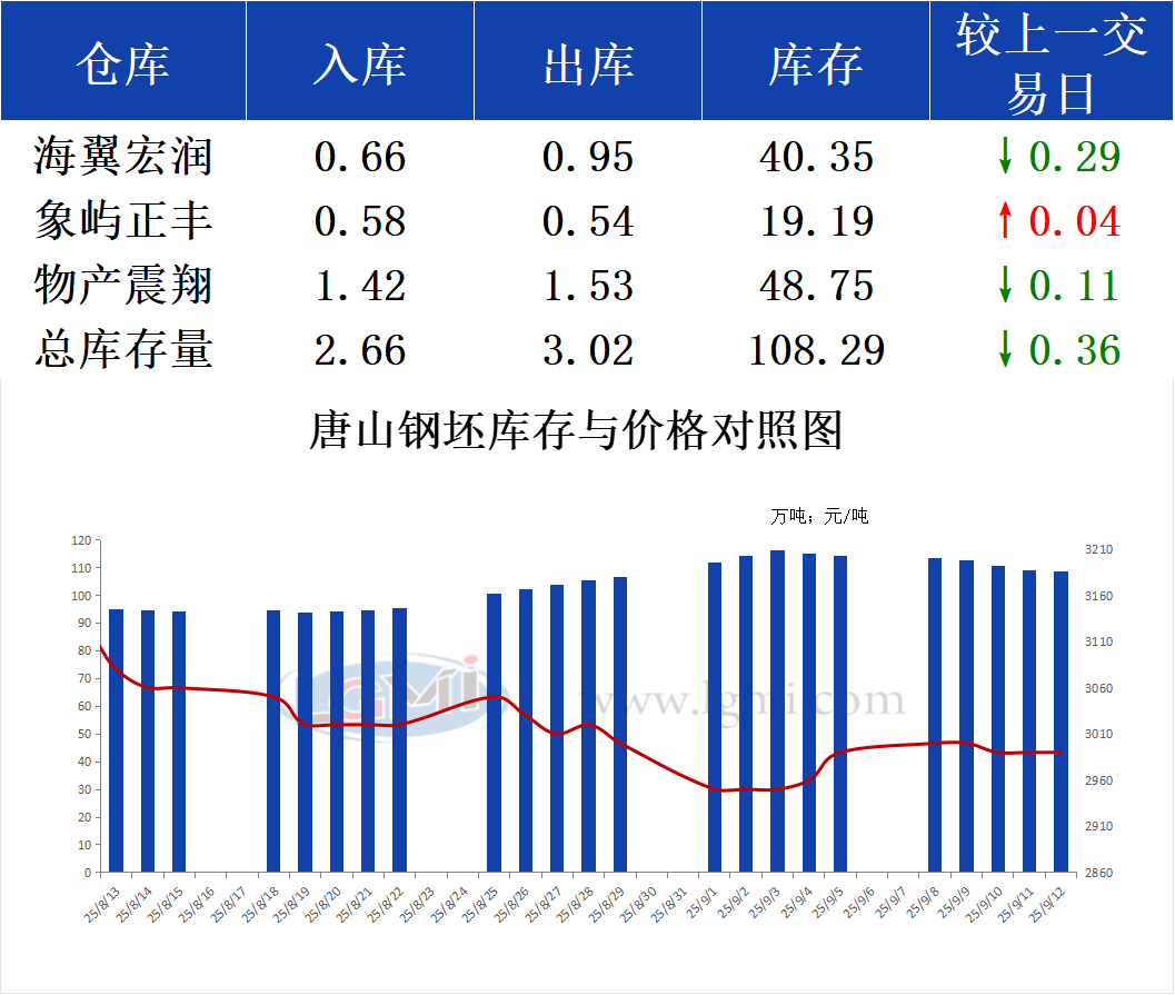 截至今晨,唐山地区样本仓库钢坯库存总量约108.29万吨,单日入库总量2.66万吨,出库总量3.02万吨。