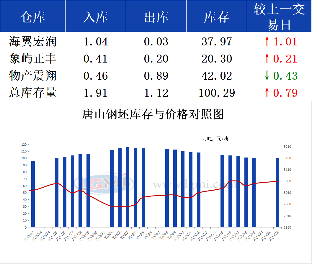 截至今晨,唐山地区样本仓库钢坯库存总量约100.29万吨,单日入库总量1.91万吨,出库总量1.12万吨。