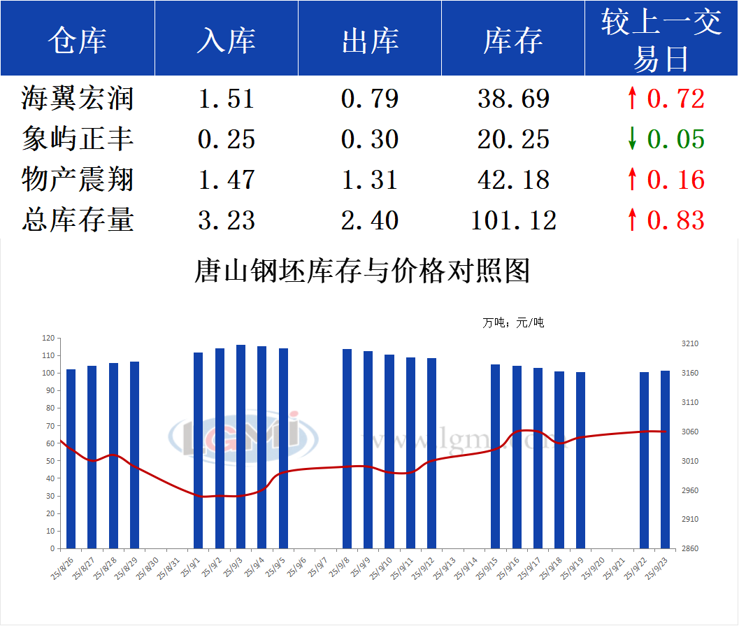 截至今晨,唐山地区样本仓库钢坯库存总量约101.12万吨,单日入库总量3.23万吨,出库总量2.4万吨。