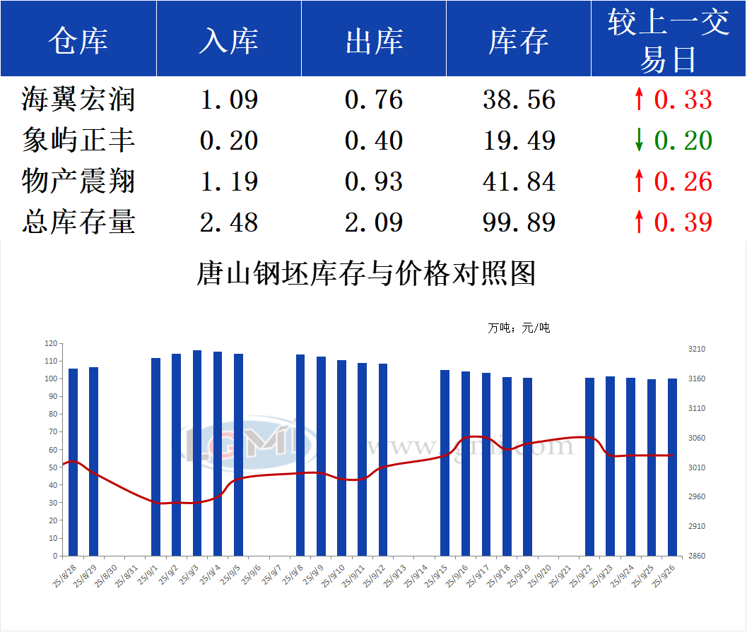 截至今晨,唐山地区样本仓库钢坯库存总量约99.89万吨,单日入库总量2.48万吨,出库总量2.09万吨。