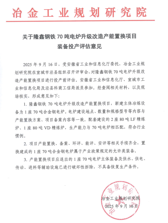 2025年9月16日,安徽省工业和信息化厅委托冶金工业规划研究院对安徽省泾县隆鑫钢铁有限公司产能置换退出设备拆除进行验收,并对电炉建设项目进行投产前评估。
