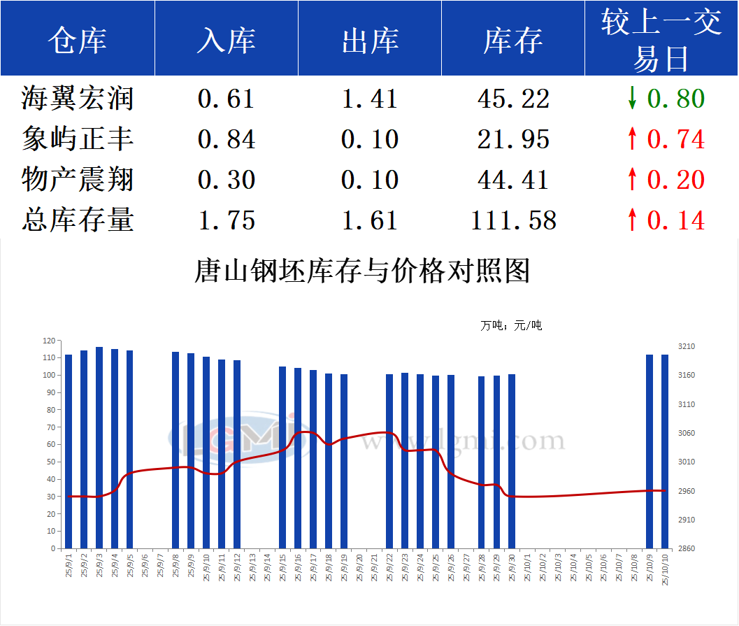 截至今晨,唐山地区样本仓库钢坯库存总量约111.58万吨,单日入库总量1.75万吨,出库总量1.61万吨。