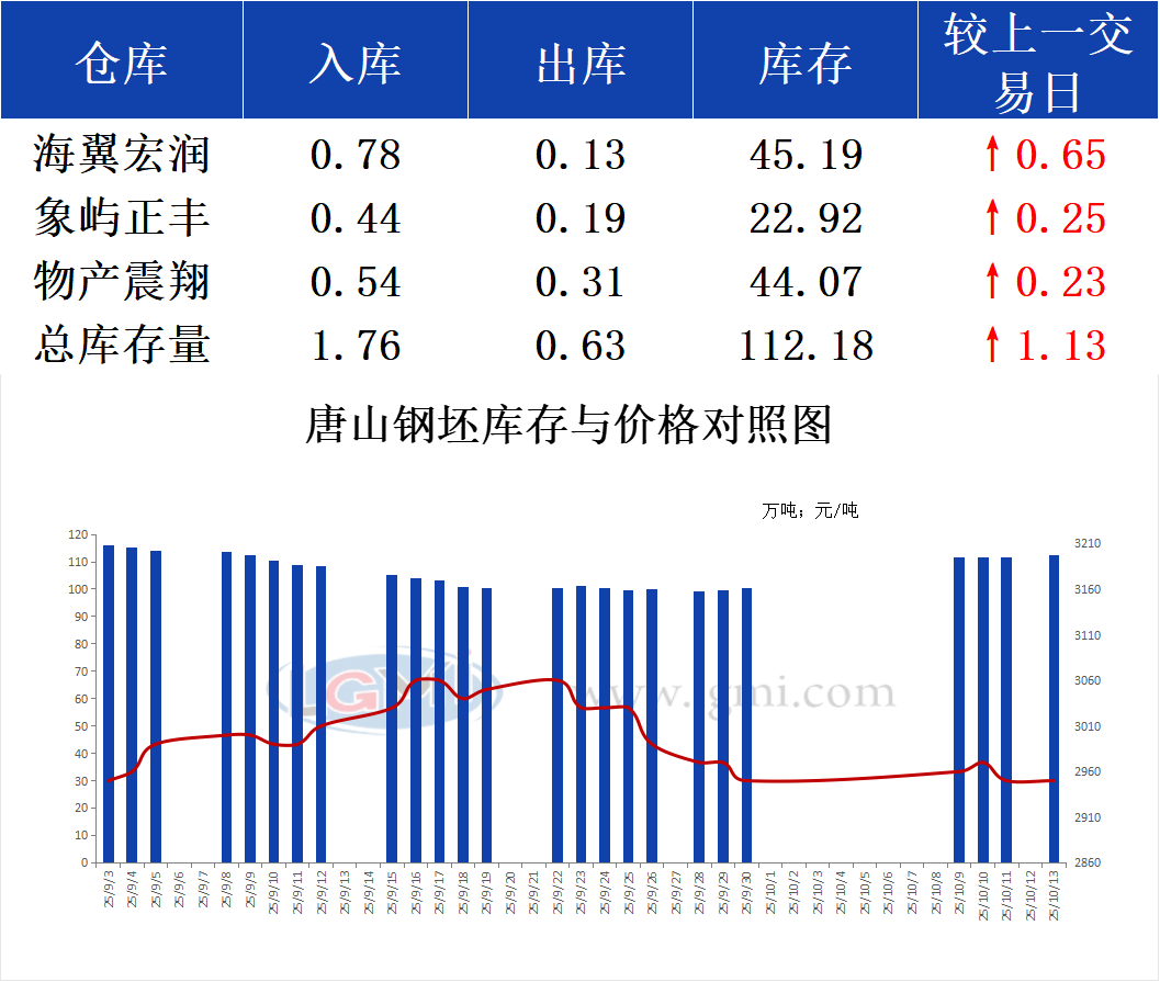 截至今晨,唐山地区样本仓库钢坯库存总量约112.18万吨,单日入库总量1.76万吨,出库总量0.63万吨。