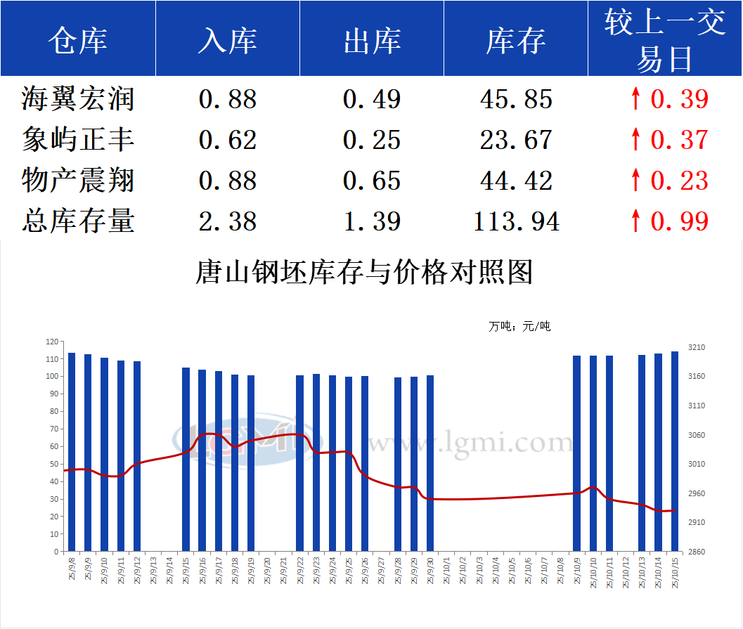 截至今晨,唐山地区样本仓库钢坯库存总量约113.94万吨,单日入库总量2.38万吨,出库总量1.39万吨。