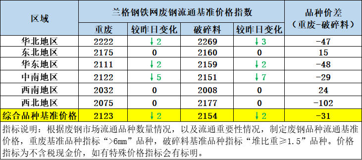 10月15日兰格钢铁网废钢流通基准价格指数为2138降2