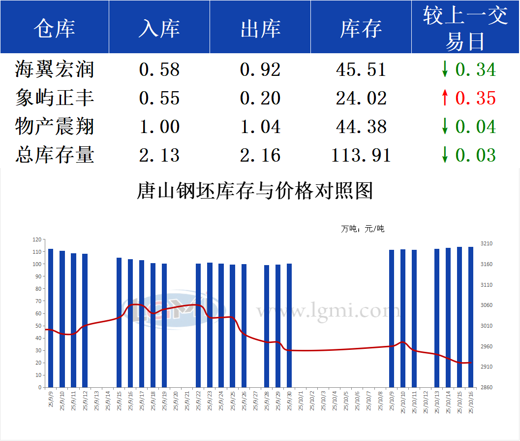 截至今晨,唐山地区样本仓库钢坯库存总量约113.91万吨,单日入库总量2.13万吨,出库总量2.16万吨。