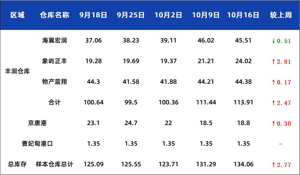 - 10月16日唐山钢坯库存周统计2025/10/16
