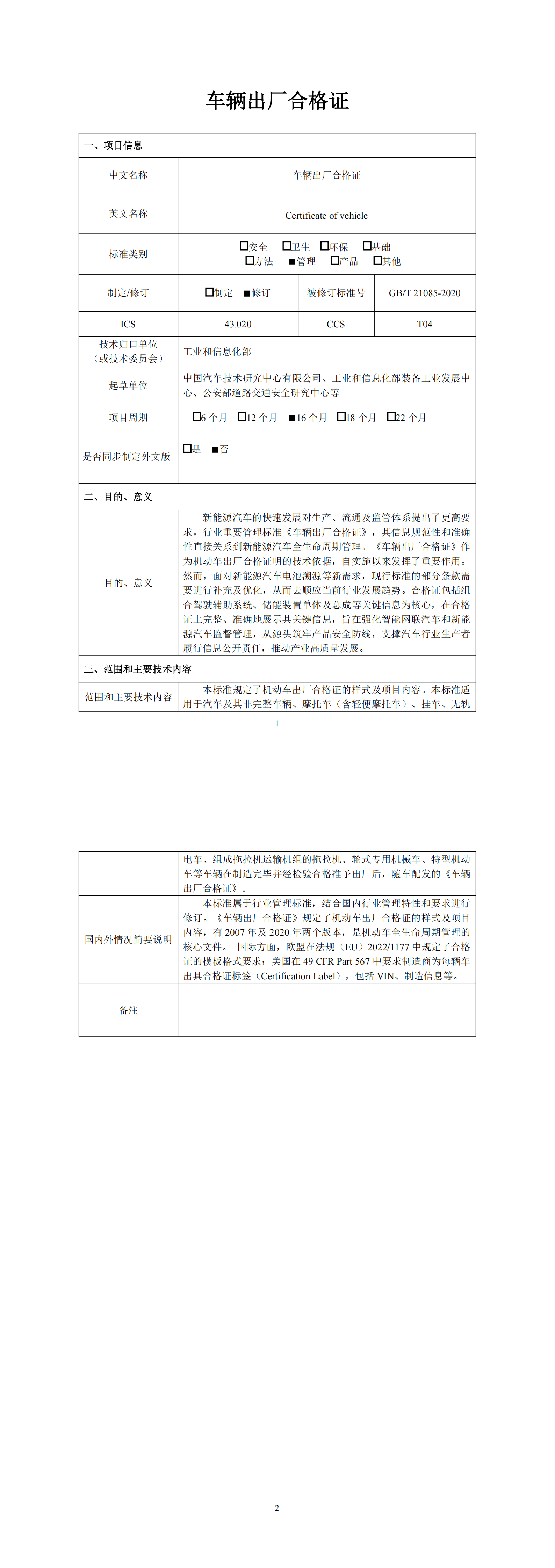 附件:1.《车辆出厂合格证》强制性国家标准项目建议书