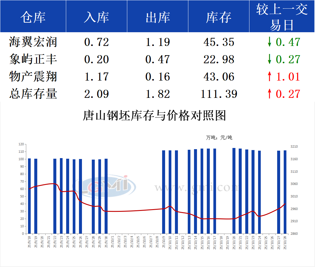 截至今晨,唐山地区样本仓库钢坯库存总量约111.39万吨,单日入库总量2.09万吨,出库总量1.82万吨。