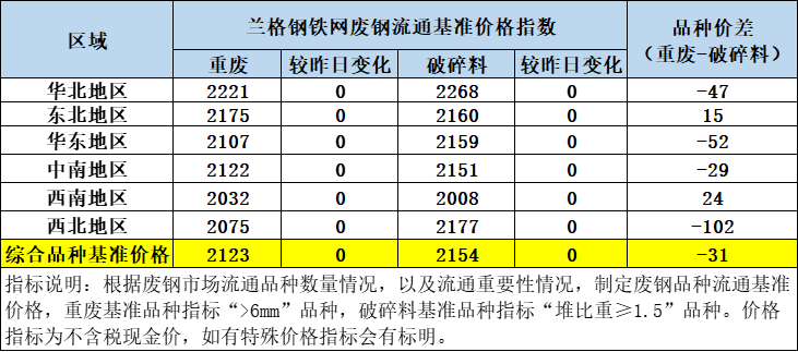 10月28日兰格钢铁网废钢流通基准价格指数为2138平:其中重废品种综合基准价格指数为2122平,破碎料品种综合基准价格指数为2154平。分区域华北地区重废2221(0)破碎料2268(0);东北地区重废2175(0)破碎料2160(0);华东地区重废2107(0)破碎料2159(0);中南地区重废2122(0)破碎料2151(0);西南地区重废2032(0)破碎料2008(0);西北地区重废2075(0)破碎料2177(0)。