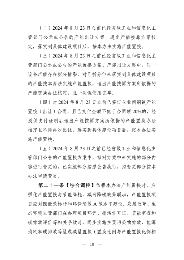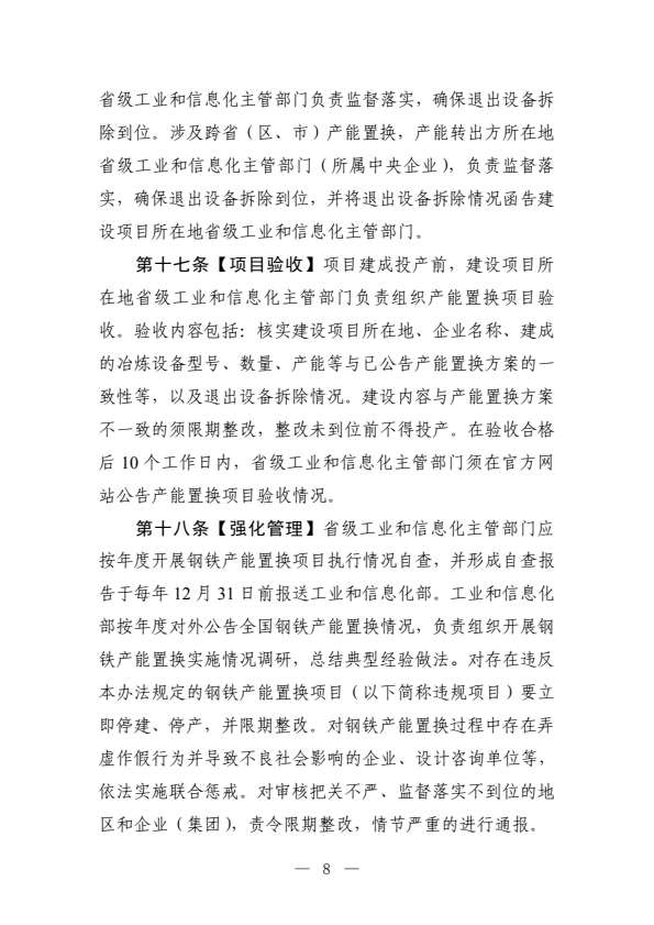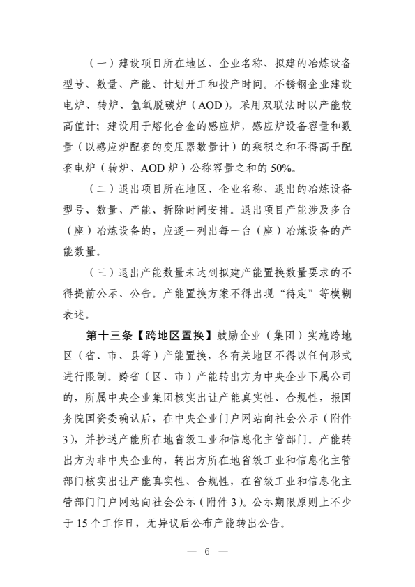 工信部网站10月24日消息,工业和信息化部对《钢铁行业产能置换实施办法》进行了修订,研究形成了《钢铁行业产能置换实施办法(征求意见稿)》,现公开征求意见。要点梳理如下:1.炼铁、炼钢产能置换比例均不低于1.5:1。对2021年6月1日之后兼并重组新取得的合规产能用于项目建设的,产能置换比例均不低于1.25:1。2.自本办法实施之日起2年,全国范围内不同企业之间可实施产能置换。之后,不同企业之间不再实施产能置换,可以通过兼并重组实现产能整合、转移。3.长江经济带地区禁止在合规园区外新建、扩建钢铁冶炼项目。重点区域严禁新增钢铁产能总量,严禁从非重点区域向重点区域转移钢铁产能,严禁不同重点区域间转移钢铁产能。4.建设项目投产前应当拆除用于置换的所有退出设备,使其不具备恢复生产条件。全文如下: