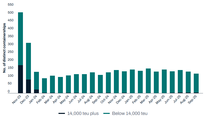 劳氏日报情报数据显示,今年穿越曼德海峡的集装箱船流量较2024年有所回升,但仍远未恢复至危机前水平。对于14,000TEU以上的大型集装箱船而言,复苏进程更为缓慢。今年1-9月期间,仅记录到6艘15,000-16,000TEU船舶完成13次穿行——这些船只全部隶属于达飞轮船运营的亚洲-地中海航线。