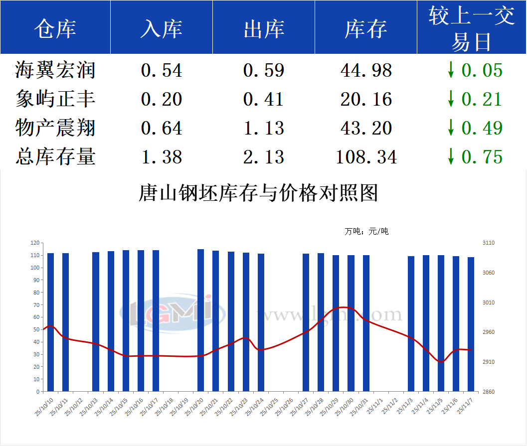 截至今晨,唐山地区样本仓库钢坯库存总量约108.34万吨,单日入库总量1.38万吨,出库总量2.13万吨。