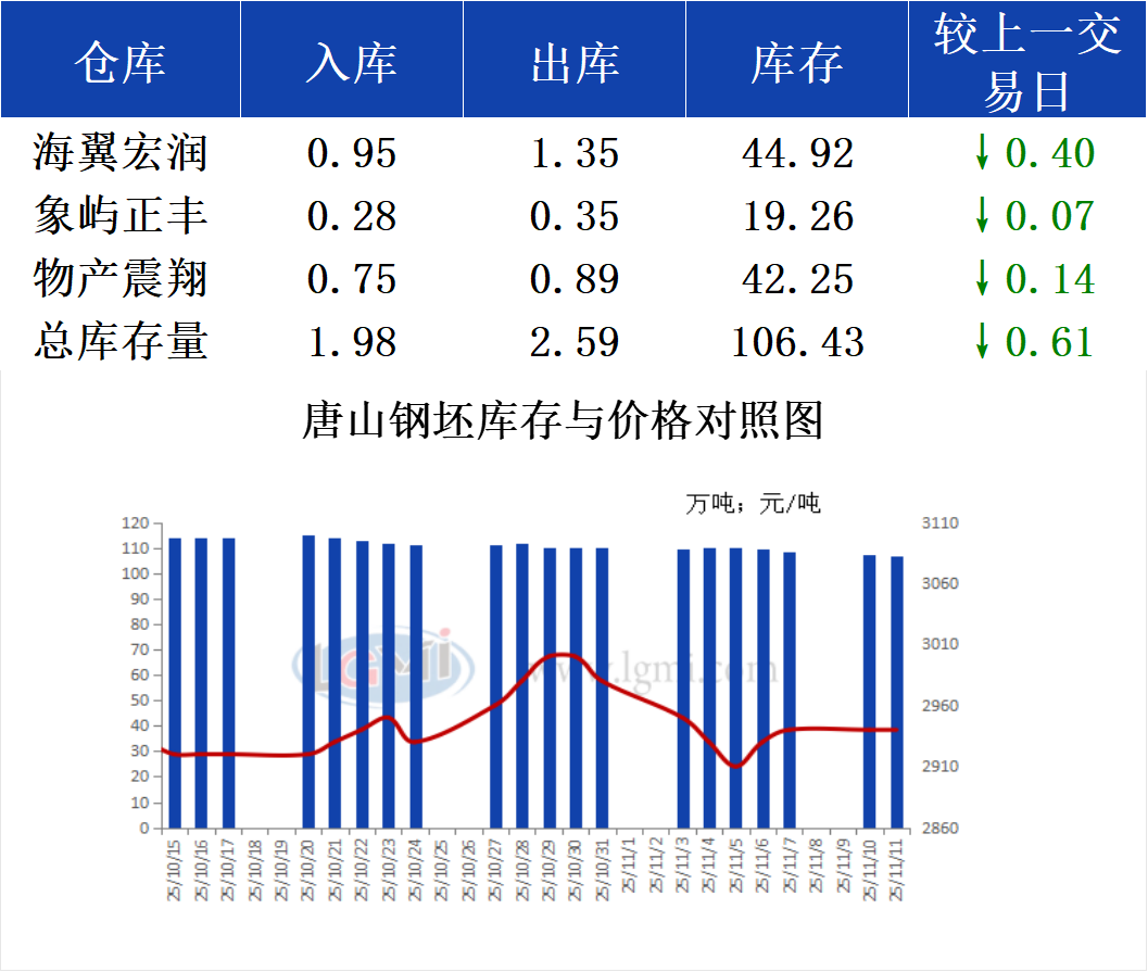 截至今晨,唐山地区样本仓库钢坯库存总量约106.43万吨,单日入库总量1.98万吨,出库总量2.59万吨。