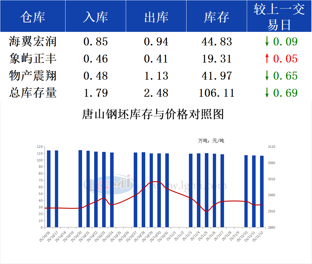 截至今晨,唐山地区样本仓库钢坯库存总量约106.11万吨,单日入库总量1.79万吨,出库总量2.48万吨。