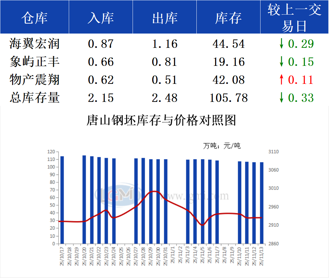 11月13日唐山钢坯库存早报