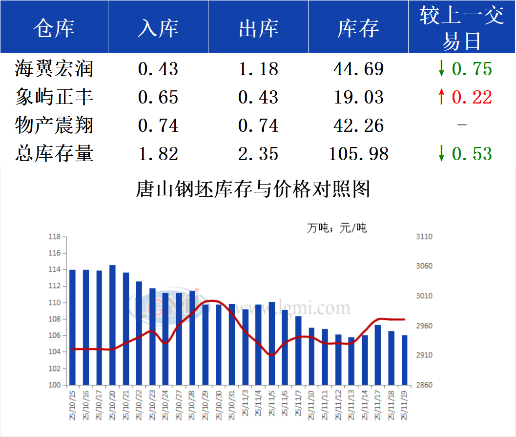 截至今晨,唐山地区样本仓库钢坯库存总量约105.98万吨,单日入库总量1.82万吨,出库总量2.35万吨。