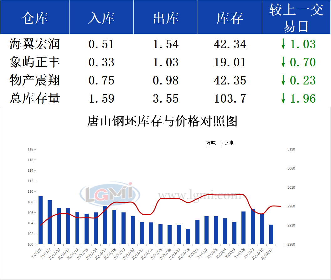 截至今晨,唐山地区样本仓库钢坯库存总量约103.7吨,单日入库总量1.59万吨,出库总量3.55万吨。