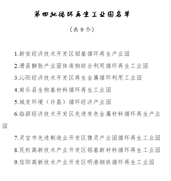 河南省公布第四批循环再生工业园名单