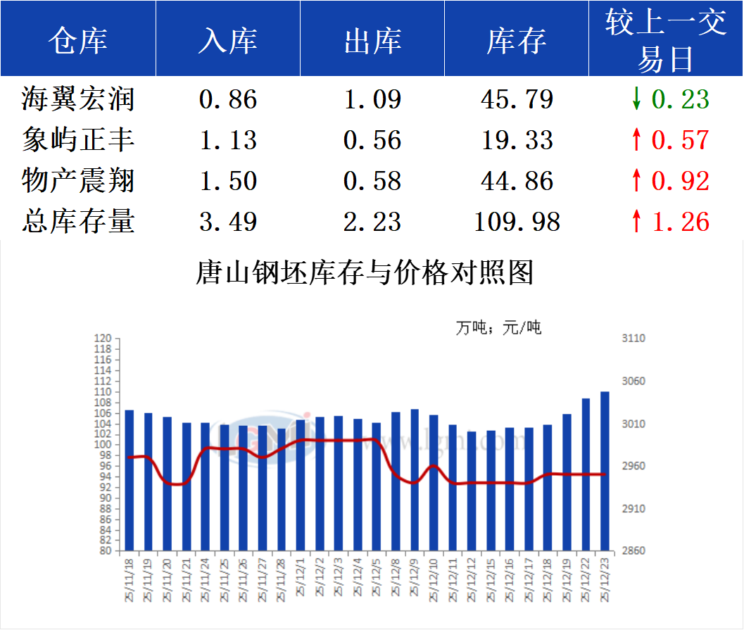 截至今晨,唐山地区样本仓库钢坯库存总量约109.98吨,单日入库总量3.49万吨,出库总量2.23万吨。