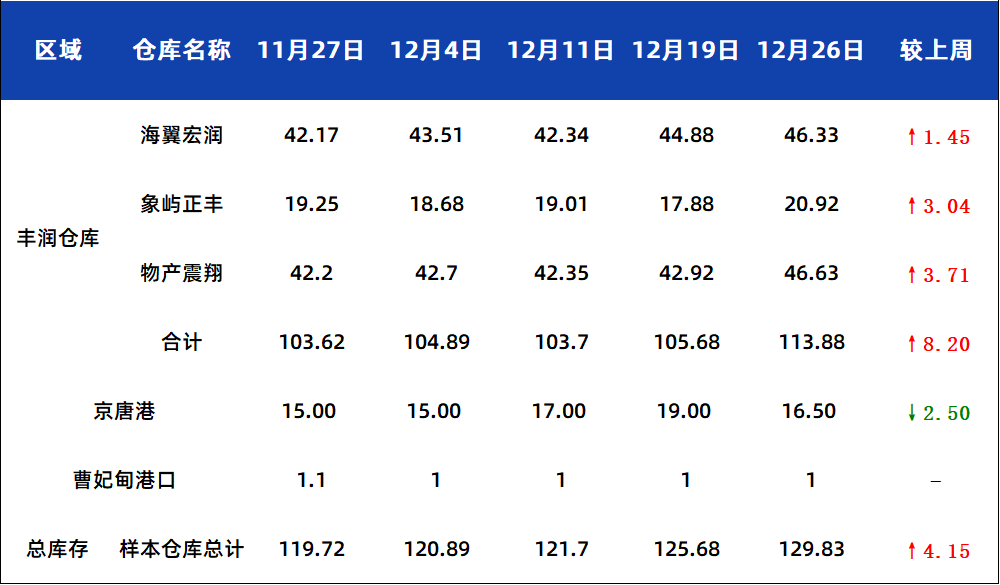 - 12月26日唐山钢坯库存周统计2025/12/26