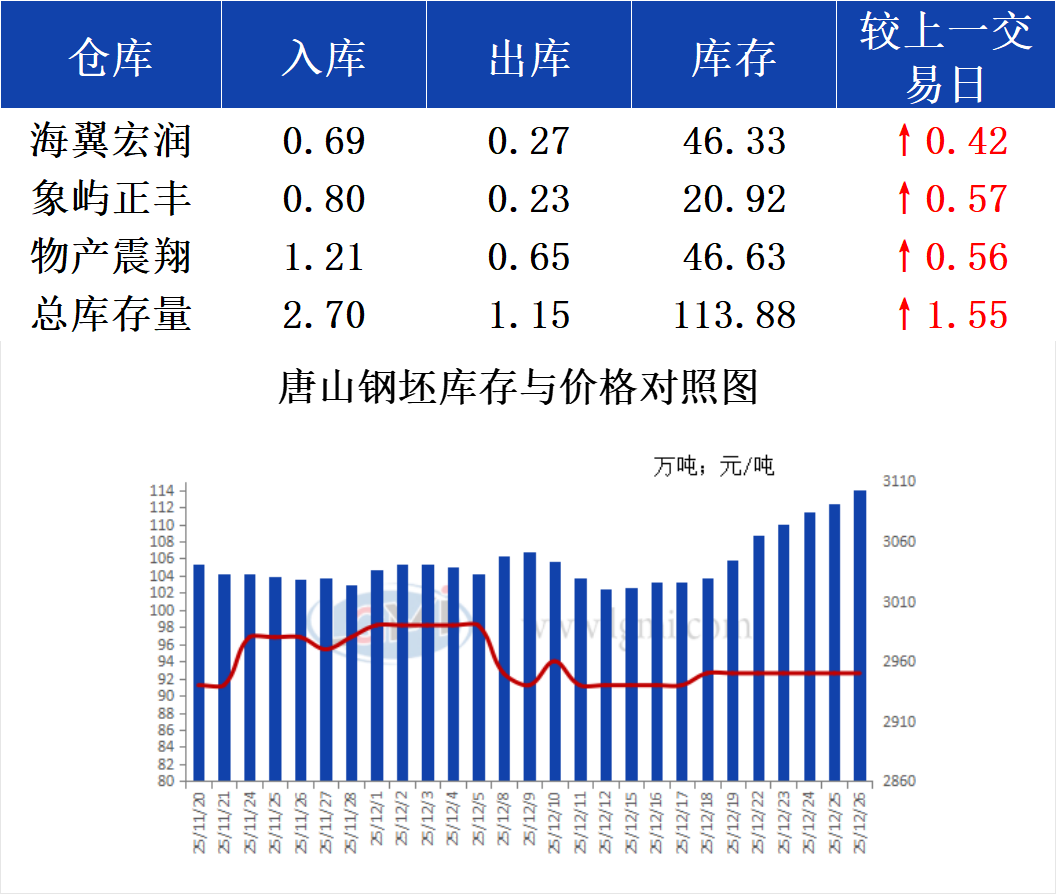 截至今晨,唐山地区样本仓库钢坯库存总量约113.88吨,单日入库总量2.7万吨,出库总量1.15万吨。