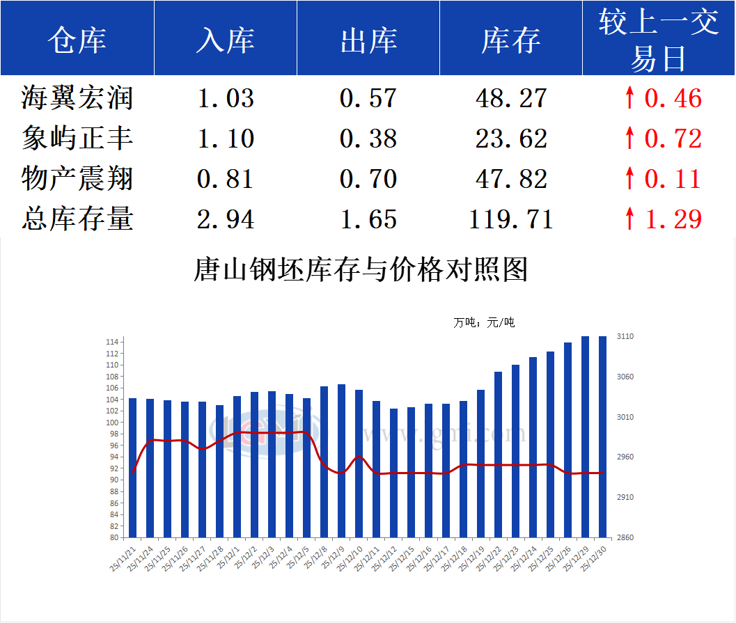 截至今晨,唐山地区样本仓库钢坯库存总量约119.71万吨,单日入库总量2.94万吨,出库总量1.65万吨。