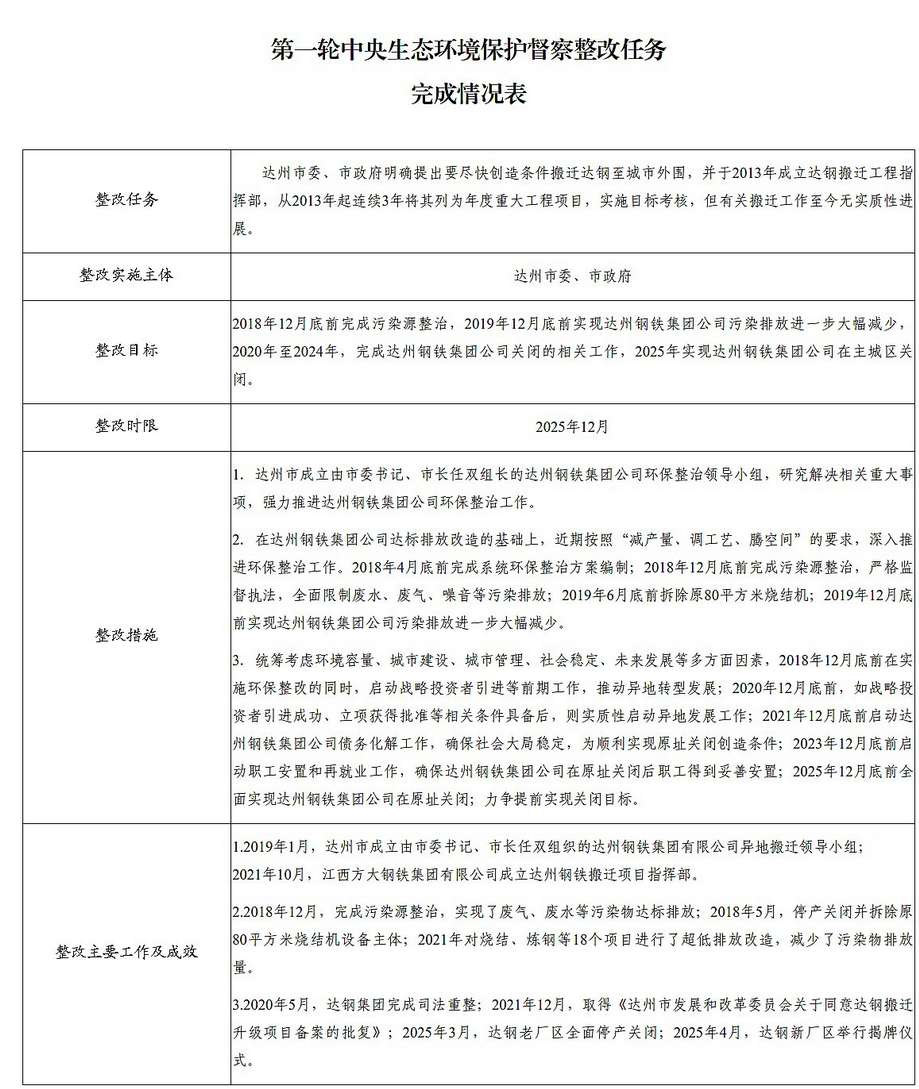 第一轮中央生态环境保护督察达州钢铁集团搬迁任务已完成,并通过验收,拟按程序实施销号。按照《四川省生态环境保护督察问题整改销号办法(2025年修订)》有关要求,现将该项任务整改完成情况予以公示,公示期为2025年12月29日至2026年1月12日。公示期间如有异议,请实名书面向四川省生态环境厅提出。邮寄地址:成都市高新区科园南路88号A2。