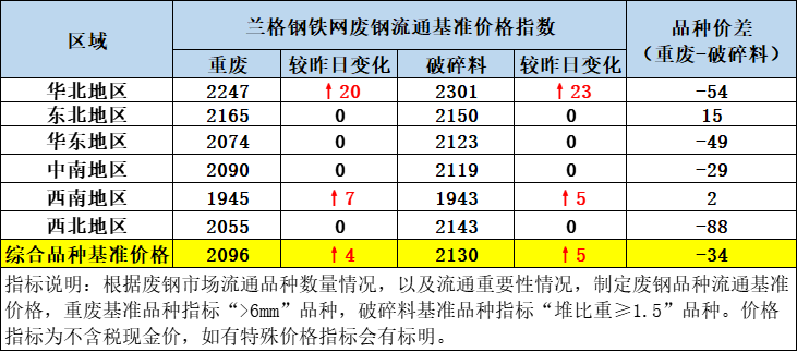 1月5日兰格钢铁网废钢流通基准价格指数为2113涨5:其中重废品种综合基准价格指数为2096涨4,破碎料品种综合基准价格指数为2130涨5。分区域华北地区重废2247(↑20)破碎料2301(↑23);东北地区重废2165(0)破碎料2150(0);华东地区重废2074(0)破碎料2123(0);中南地区重废2090(0)破碎料2119(0);西南地区重废1945(↑7)破碎料1943(↑5);西北地区重废2055(0)破碎料2143(0)。