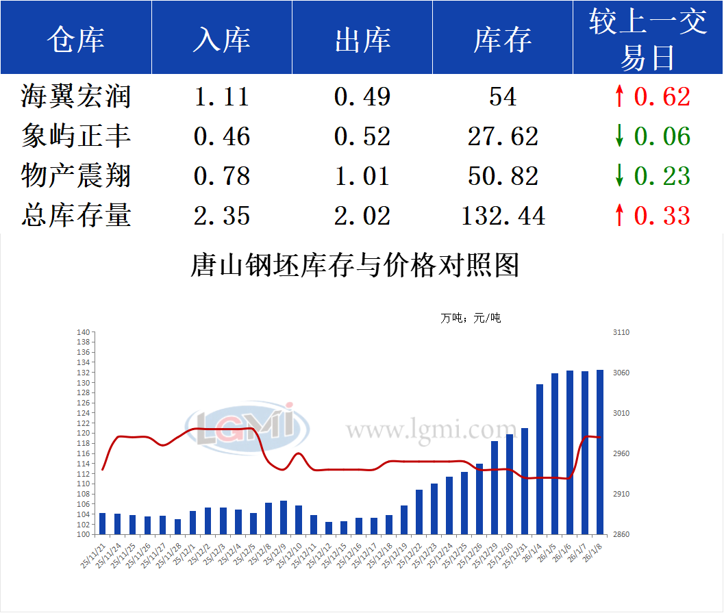 截至今晨,唐山地区样本仓库钢坯库存总量约132.44万吨,单日入库总量2.35万吨,出库总量2.02万吨。